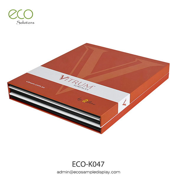 5- pages sample folder made of 3mm grey board with cut-into size 5mm greyboard layout to protect quartz stone surfaces sample and keep sample in position. The sample book inside also can be cut-into size foam.