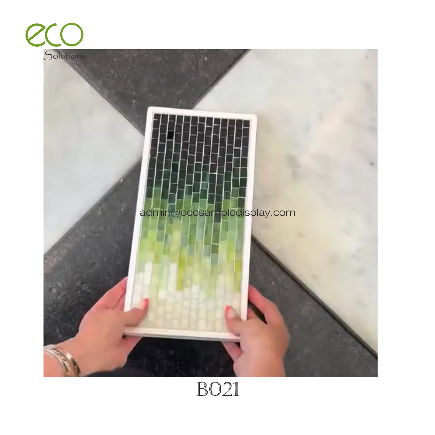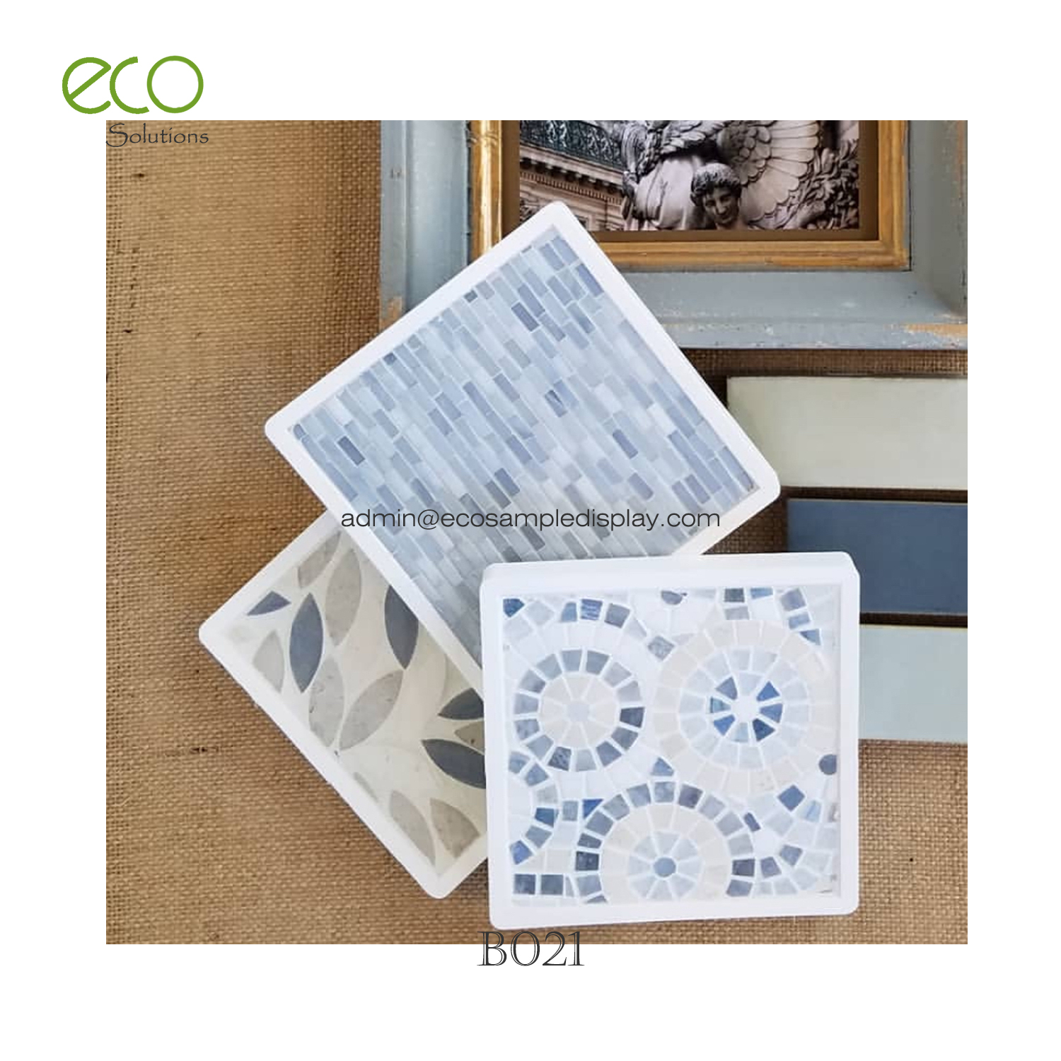 ECO display offer Plastic sample trays sample boards for 6X12" or 12X12" mosaics tiles in white. Elgant sample boards to showcase your mosaic patterns and colours.